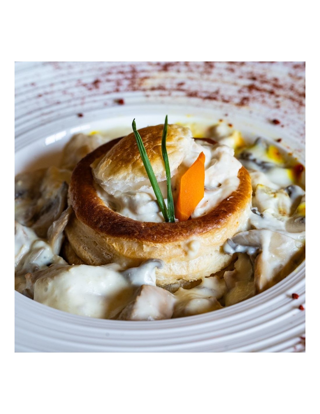 La bouchée à la reine se distingue par sa sauce blanche onctueuse qui enveloppe une garniture généreuse.